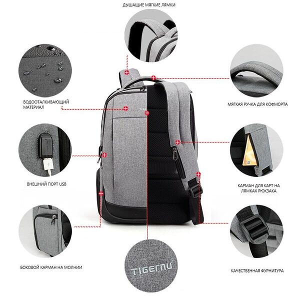 Городской рюкзак Tigernu T-B3503 классической формы и строгого дизайна. Выполнен из плотного материала Оксфорд, который устойчив к намоканию, разрывам и порезам. Имеет воздухопроницаемую и удобную спинку из сетчатого материала, крепкую ручку для переноски, мягкие и регулируемые по длине лямки. Оснащен прочной фурнитурой и двуслойными молниями с металлическими замками. Внутри разделен на 3 вместительных отделения. Основное отделение разместит в себя все необходимые вещи. В нескольких карманах можно расположить документы, мобильный телефоне, мобильные аксессуары и другие мелочи. В кармане на молнии поместятся ценные предметы. Дополнительное, ближе к фронтальной части, включает несколько карманов разных по размеру и карабин для ключей. Все внутренние отделения имеют водонепроницаемую подкладку. Ближе к спинке расположилось защитное отделение для ноутбуков с диагональю экрана 15,6 дюймов. Стенки отделения усилены специальным материалом, которые защитит ноутбук от ударов. Слева находится сетчатый карман на резинке для бутылок или зонта. С правой стороны — удобный карман на молнии. На одной из лямок имеется крепление для очков, на другой — карман для карточек. Рюкзак оснащен внешним портом USB. Благодаря ему можно легко зарядить любой гаджет через Power Bank, подключив к нему USB-шнур. Наличие специальной лямки на спинке позволяет крепить рюкзак к ручке дорожного чемодана. Потайной карман подойдет для размещения ценных вещей.