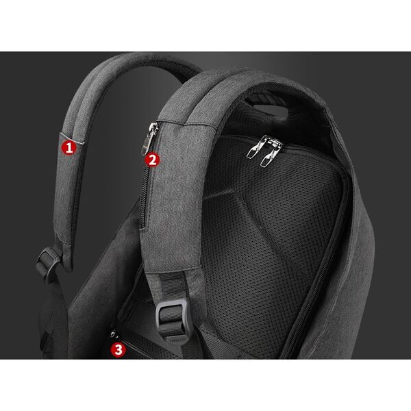 Рюкзак Tigernu отличается большой вместительностью. Полностью открывающаяся крышка предоставляет доступ ко всем вещам. На внутренней части передней панели находятся: мини-отсек для Power Bank, два кармана для ноутбука с диагональю экрана 15,6 дюймов и планшета. Они фиксируются эластичной крепежной лентой. Задняя внутренняя часть рюкзака оснащена небольшим карманом для гаджетов и аксессуаров, отделением на замке для размещения ценных вещей. Лямки T-B3615B имеют карман на молнии для банковских карт и отверстие для фиксации очков. В задней спинке предусмотрен потайной карман для мобильного телефона. Из других особенностей: наличие бокового потайного кармана на молнии, который превращается в сетчатую сумку для зонта, USB-разъема для зарядки и порта для наушников.
