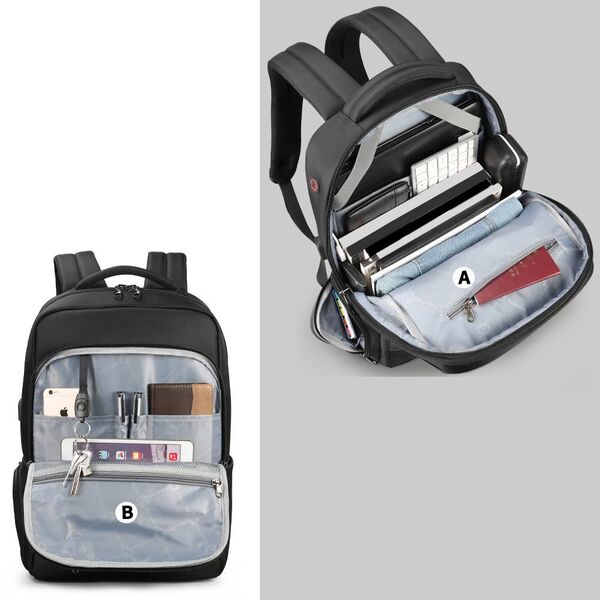 Стильный городской рюкзак с кожаными вставками Tigernu T-B3668 станет удачным компаньоном, как для путешествий, так и для деловых встреч. Рюкзак имеет водоотталкивающую поверхность и светоотражающую полоску на фронтальной части, которая обезопасит на дороге. Сдвоенные молнии с металлическими собачками, закрывающие основное отделение, защитят содержимое рюкзака. Ортопедическая спинка уменьшит нагрузку на спину, а сетчатый материал не даст ей потеть. Мягкие и регулируемые по длине лямки S-образной формы совсем не натирают плечи и выдерживают до 20 кг веса. Основное отделение T-B3668 предназначено для размещения большого количества вещей. Ноутбук здесь располагается в глубоком кармане, ближе к спинке рюкзака. Для надежности он закрепляется двумя специальными лентами. В других карманах можно разместить разные мелочи, гаджеты, компьютерные аксессуары. Дополнительный отсек содержит в себе большое количество разных по размеру отделений. Для ценных вещей предусмотрен карман на молнии. Ключи могут закрепляться на специальном карабине. На фронтальной части предусмотрен небольшой карман на молнии. Также небольшие карманы есть по бокам — один для зонтов или бутылок. Самые ценные вещи располагаются в потайных карманах: на одной из лямок и в спинке. Последний карман оформлен RFID-покрытием, которое защитит банковские карты от несанкционированного считывания. На рюкзаке имеется крепежная лента для фиксации рюкзака на ручке дорожного чемодана, выход для наушников и внешний USB-разъем для подзарядки гаджетов на ходу.