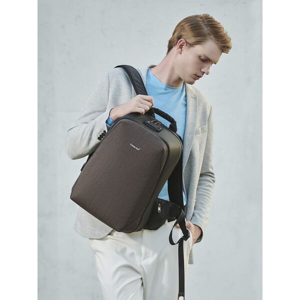 Надежный рюкзак-антивор Tigernu T-B3669 защитит вещи от злоумышленников. Его основной отсек открывается с помощью потайной молнии, скрытой под тканевым слоем. А сами собачки скрепляются встроенным кодовым замком, который обеспечит максимальную безопасность. Наличие потайного кармана в спинке изделия позволит не бояться за ценные вещи. Рюкзак можно использовать в любых условиях и для разных целей: ходить на работу, учебу, ездить на отдых или прогулку по городу. Он имеет влагозащищенную поверхность, которая защитит содержимое от промокания. Мягкая вентилируемая спинке обеспечит комфорт спине даже жарким летом. Широкие мягкие лямки регулируются по длине, что позволяет подстроить рюкзак под себя. Верхняя ручка тоже мягкая и для надежности прошита несколькими швами. В Tigernu предусмотрен только один вместительный отдел. Для удобства он раскрывается на 180 градусов, что обеспечивает свободный доступ к вещам. Для ноутбука на 15,6 дюймов и мобильных гаджетов имеются разные по размеру карманы. По бокам модели T-B3669 расположились два кармана: один с сетчатым мешком на карабине, другой — на молнии с карабином для ключей внутри. Для подзарядки в рюкзаке предусмотрен внешний USB-порт, а для закрепления на ручке дорожной сумки — багажный ремень.