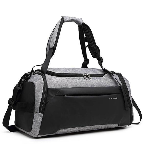 Дорожная сумка BANGE BG8981 отличается тем, что может легко превратиться в удобный рюкзак. В роли лямок здесь будет выступать двойная ручка, которая соединяется широкой лентой на липучке для удобства переноски изделия в руках. Для ношения сумки на плечах лямки оснащены мягкими накладками. Чтобы подстроить лямки под себя, можно отрегулировать их по длине. Еще одна короткая ручка находится на одной из сторон сумки, предназначена для переноски в руке. Длинная ручка, прикрепляющаяся на карабинах, идет с сумкой в комплекте. Сама дорожная сумка BANGE выполнена из плотного водоотталкивающего материала. Она имеет устойчивое прочное дно с резиновыми ножками. В сумке BG8981 предусмотрено большое количество отделений для размещения всего необходимого: одежды, обуви, книг, тетрадей, канцелярии, мобильных и компьютерных аксессуаров и гаджетов. Основное отделение имеет верхнюю откидывающуюся крышку с круговой молнией. Внутри есть несколько карманов, в том числе и на молниях, для предметов разного размера. Для вещей, которые должны быть под рукой, имеется сетчатый карман. Также несколько карманов на молниях расположились по всей поверхности рюкзака: три вместительные кармана по бокам и два кармана на круговых молниях с двух сторон сумки. Один карман предназначен для размещения обуви или мокрых вещей, второй – для предметов личной гигиены.